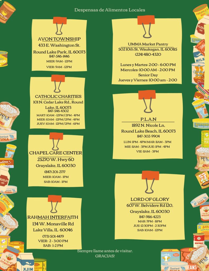 Si usted o alguien que conoce necesita ayuda con alimentos, las despensas que aparecen a continuación ofrecen comida gratuita para personas y familias en el área. Los horarios y servicios varían.
